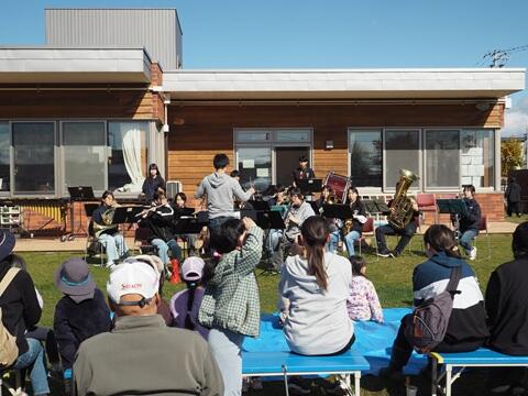 この日は少し冷たい風が吹いていたものの天候に恵まれ、子ども達や保護者の方が行き来する自由な雰囲気でアンコールを含め4曲演奏し、また演奏終了後は一緒に遊んだりして楽しい時間を過ごすことができました。