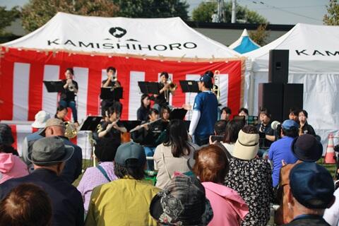その第1弾として、10月5日(日)に開催された「超かみしほろ農商工生涯学習SDGsまつり」で演奏しました。当日は夏の終わりを思わせるような少し汗ばむ陽気の中、道の駅かみしほろのイベントステージでアンコールを含む4曲を披露しました。