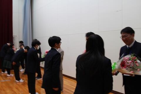 3月いっぱいで本校を異動、退職される教職員6名が紹介され、一人ずつ最後のメッセージを送りました。その後花束が贈られ、生徒が作った花道を通り会場を後にしました。