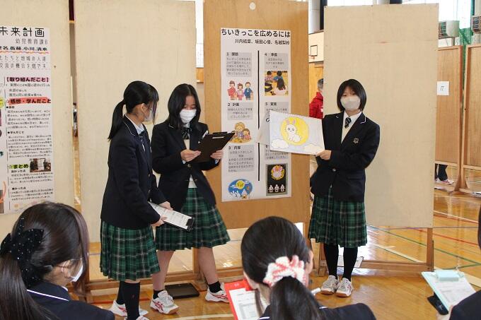 各班でブースに分かれて、発表を行いました!ステージとは違い、聞き手との距離が近くて、少し緊張していた様子でしたが、自分たちが考えたことや、実践してきたことを聞きに来てくれた1年生や地域の方々に発表していました。